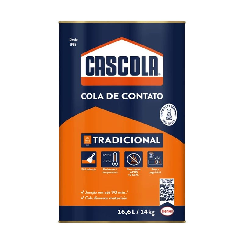 Cola Cascola Tradicional sem Toluol embalagem de 14Kg é uma cola de contato de alto desempenho, sua fórmula não contém toluol o solvente que pode causar dependência química, esta cola tem uma alta força de colagem e performance, tem secagem rápida e é resistente à água. É indicado especialmente para a colagem de laminados decorativos, pisos de borracha, couro, metais, lambris e diversos materiais sintéticos em madeiras compensadas, aglomerados, MDF, HDF, concreto, cimento, entre outros. Pode ser utilizado em ambientes internos e externos.