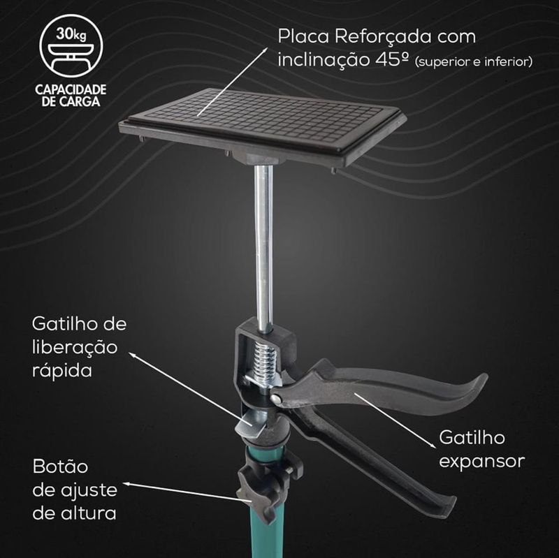 Simplifique suas instalações e garanta um resultado profissional com o Suporte Telescópico Renna. Solução perfeita para profissionais marceneiros, instaladores ou faça você mesmo (DIY), que necessitam de uma ferramenta eficiente e versátil, o Suporte Telescópico Renna suporta cargas de até 30kg, permitindo que você eleve até mesmo os armários mais pesados com total segurança e estabilidade. Com altura regulável de 1.150 a 2.900mm e base inferior e superior ajustável entre 45 a 90º, o suporte oferece precisão e flexibilidade para o uso diário, segurando firmemente os móveis ou objetos no local desejado e possibilitando que suas mãos fiquem livres para a fixação.Principais Características: