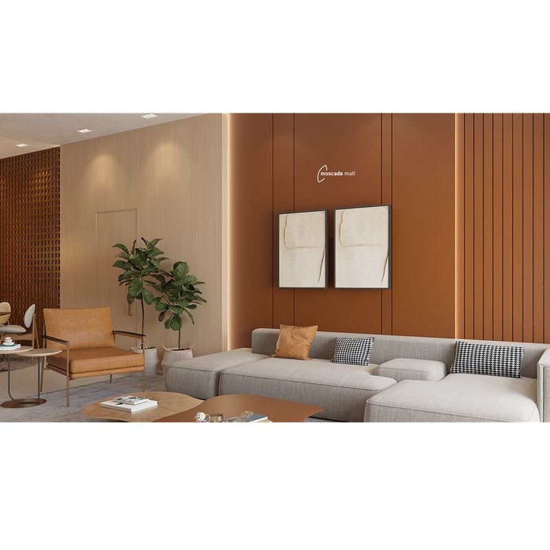 O MDF BP Matt Moscada Arauco traduz a intensidade da noz-moscada em um padrão que une conforto e sofisticação. Perfeito em diálogo com diferentes tipos de madeira, este tom proporciona combinações agradáveis que transformam qualquer espaço em um refúgio natural.