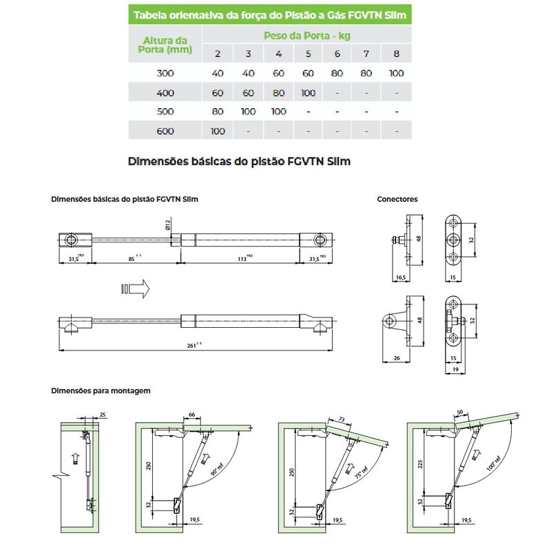 Inclui: 01 pistão a gas 60N, 01 conector para lateral, 01 conector para porta, tampas de acabamento dos